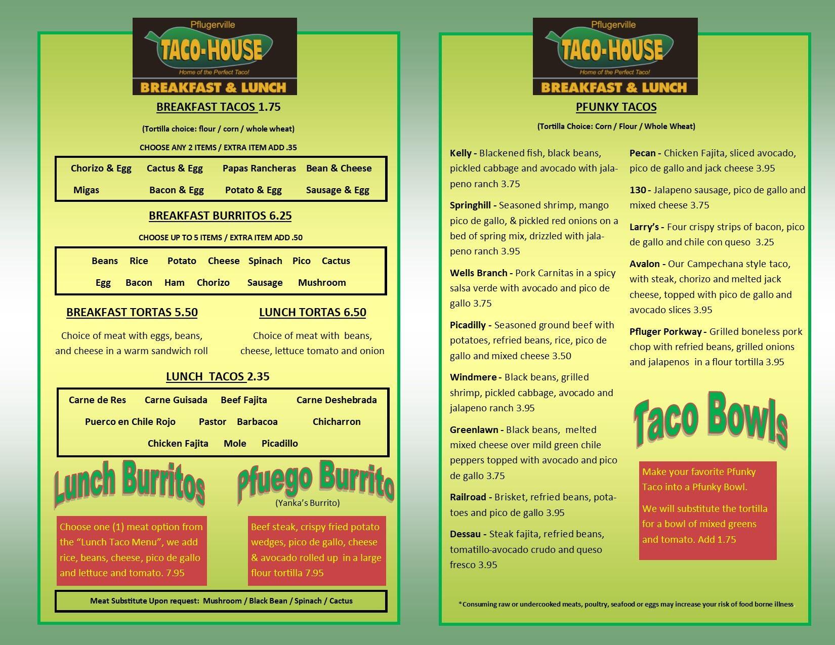 Pflugerville TX 78660 Map Directions Phone. See more of Pflugerville Taco House on Facebook. You can go the more traditional egg and bacon egg and sausage etc or if you want to branch out they have Chorizo Eggs Migas Tacos and Papas Rancheras.